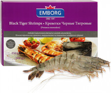 | Название | Креветки Emborg черные тигровые с головой в панцире мороженые 13/15 850 г |