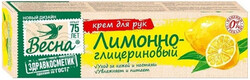 Крем для рук Весна Здравкосметик Лимонно-глицериновый специально разработан для комплексного ухода за кожей рук и ногтями. Благодаря активным компонентам крем обеспечивает необходимое питание и увлажнение кожи рук, устраняет сухость и шелушение. Экстракт лимона обогащает кожу рук витаминами и тонизирует ее, а входящий в состав косметический кератин укрепляет ногтевую пластину.