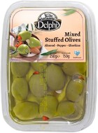 Ассорти оливок Delphi фаршированных миндалем пастой из перца корнишонами в рассоле 250 гр., лоток